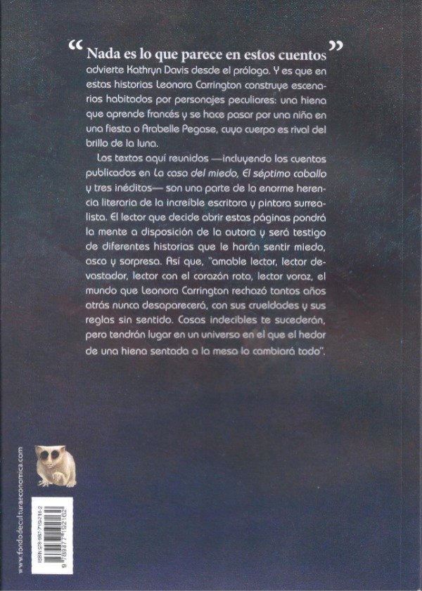 advierte Kathryn Davis desde el prólogo. Y es que en estas historias Leonora Carrington construye escenarios habitados por personajes peculiares: una hiena que aprende francés y se hace pasar por una niña en una esta o Arabelle Pegase, cuyo cuerpo es rival del brillo de la luna. Los textos aquí reunidos —incluyendo los cuentos publicados en La casa del miedo, El séptimo caballo y tres inéditos— son una parte de la enorme herencia literaria de la increíble escritora y pintora surrealista. El lector que decide abrir estas páginas pondrá la mente a disposición de la autora y será testigo de diferentes historias que le harán sentir miedo, asco y sorpresa. Así que, “amable lector, lector devastador, lector con el corazón roto, lector voraz, el mundo que Leonora Carrington rechazó tantos años atrás nunca desaparecerá, con sus crueldades y sus reglas sin sentido. Cosas indecibles te sucederán, pero tendrán lugar en un universo en el que el hedor de una hiena sentada a la mesa lo cambiará todo”.