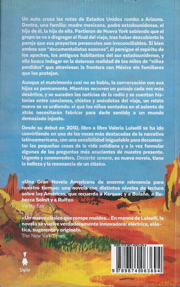 Desde su debut en 2010, libro a libro Valeria Luiselli se ha ido convirtiendo en una de las voces más destacadas de la narrativa latinoamericana, con una sensibilidad inigualable para documentar las pequeñas cosas de la vida cotidiana y a la vez formular algunas de las preguntas más acuciantes de nuestro presente. Urgente y conmovedora, Desierto sonoro, su nueva novela, tiene la belleza y la resonancia de un clásico.